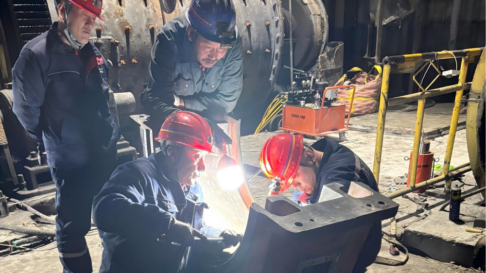 故障發(fā)生后,白玉銀興公司經(jīng)理田東清迅速抵達現(xiàn)場,根據(jù)設備故障狀況進行現(xiàn)場研判并采取果斷措施進行停機搶修。在搶修現(xiàn)場,黨員干部主動亮身份、扛重擔,充分發(fā)揮先鋒模范作用,成為搶修隊伍中的“主心骨”。田東清帶領維修團隊趴在設備旁仔細排查故障點,在刮瓦環(huán)節(jié)精細操刀,憑借多年豐富經(jīng)驗和專業(yè)技術儲備,勾畫出完美的弧線。為了加快搶修進度,搶修人員放棄休息時間,輪班作戰(zhàn)、每天連續(xù)工作16小時,累了就趴在桌上短暫小憩,始終堅守在搶修一線。食堂將飯菜、飲用水送到現(xiàn)場,確保搶修人員有充沛的體力。
